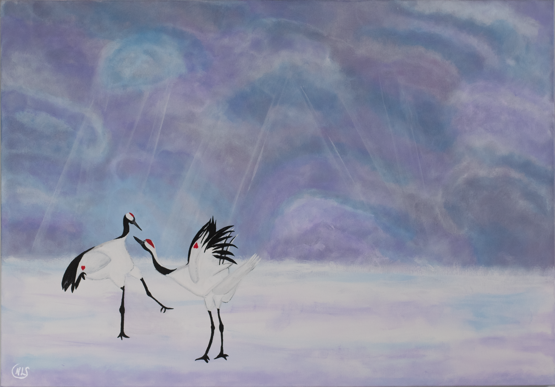 Red Cranes are known for executing a mating dance when it is time to find a mate. The title of the piece was also inspired by the dance and by love with Valentine's approaching.